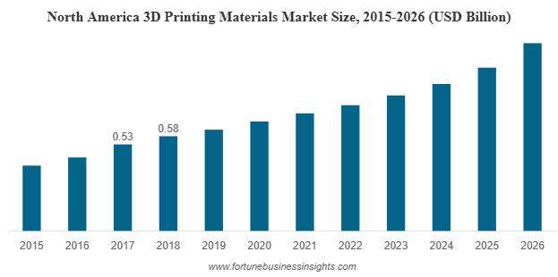 2018年、世界の3Dプリント材料市場は15億3,000万米ドルと評価され、2026年には37億8,000万米ドルに達すると大幅に成長すると予想されています。この成長は、予測期間全体にわたって12.1%という力強い年平均成長率(CAGR)を示しています。2018年の世界市場は北米が牽引し、37.91%という圧倒的なシェアを占めました。この地域では、米国が主要な貢献国であり、幅広い業界における積層造形の採用増加を背景に、3Dプリント材料市場は2026年までに12億8,000万米ドルに達すると予測されています。